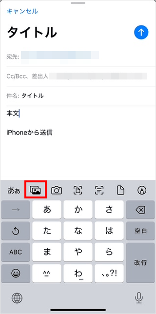 ※カーソルの位置に画像が添付されます。本文を入力した場合は、文末または、改行をして新しい行にカーソルを表示させるようにします。