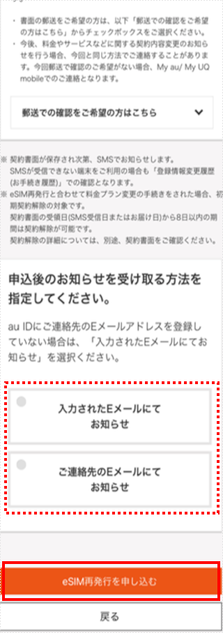 申込後のお知らせ受取方法を選択して[eSIM再発行を申し込み]をタップします。