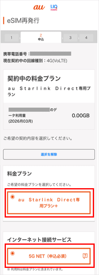 [au Starlink Direct専用プラン+]と[5G NET(申込必須)]をタップします。