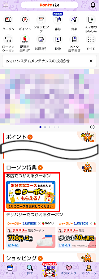 「ローソン特典」の[お店でつかえるクーポン]をタップします。