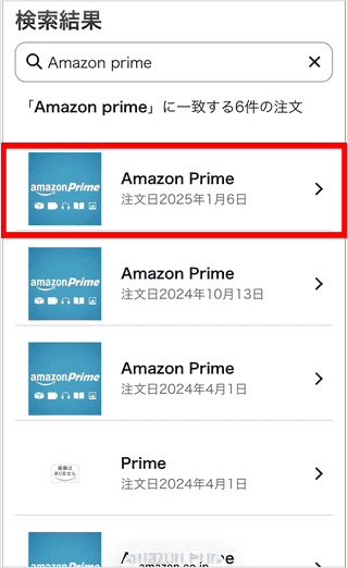 「Amazon Prime」の注文履歴のうち、最新の履歴が「水色」の「Amazon Prime」となっている場合、こちらをタップします。