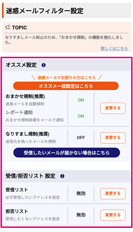 | 1)おススメ設定 | おススメ一括設定 | 迷惑メールに多く見られる「なりすまし」メールや迷惑メールの疑いのあるメールをブロックします。 何を設定したらよいか分からない方におススメです。 |