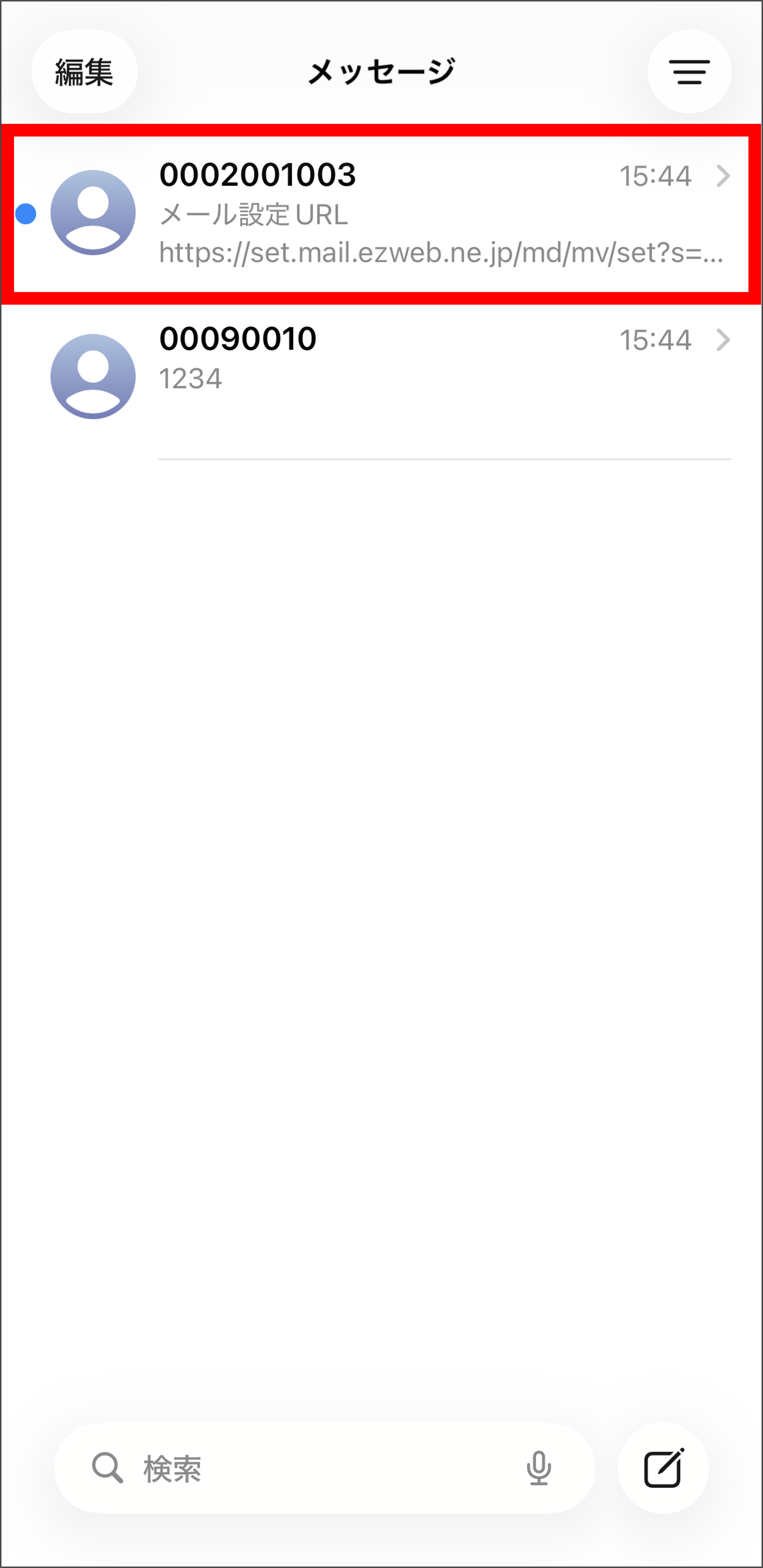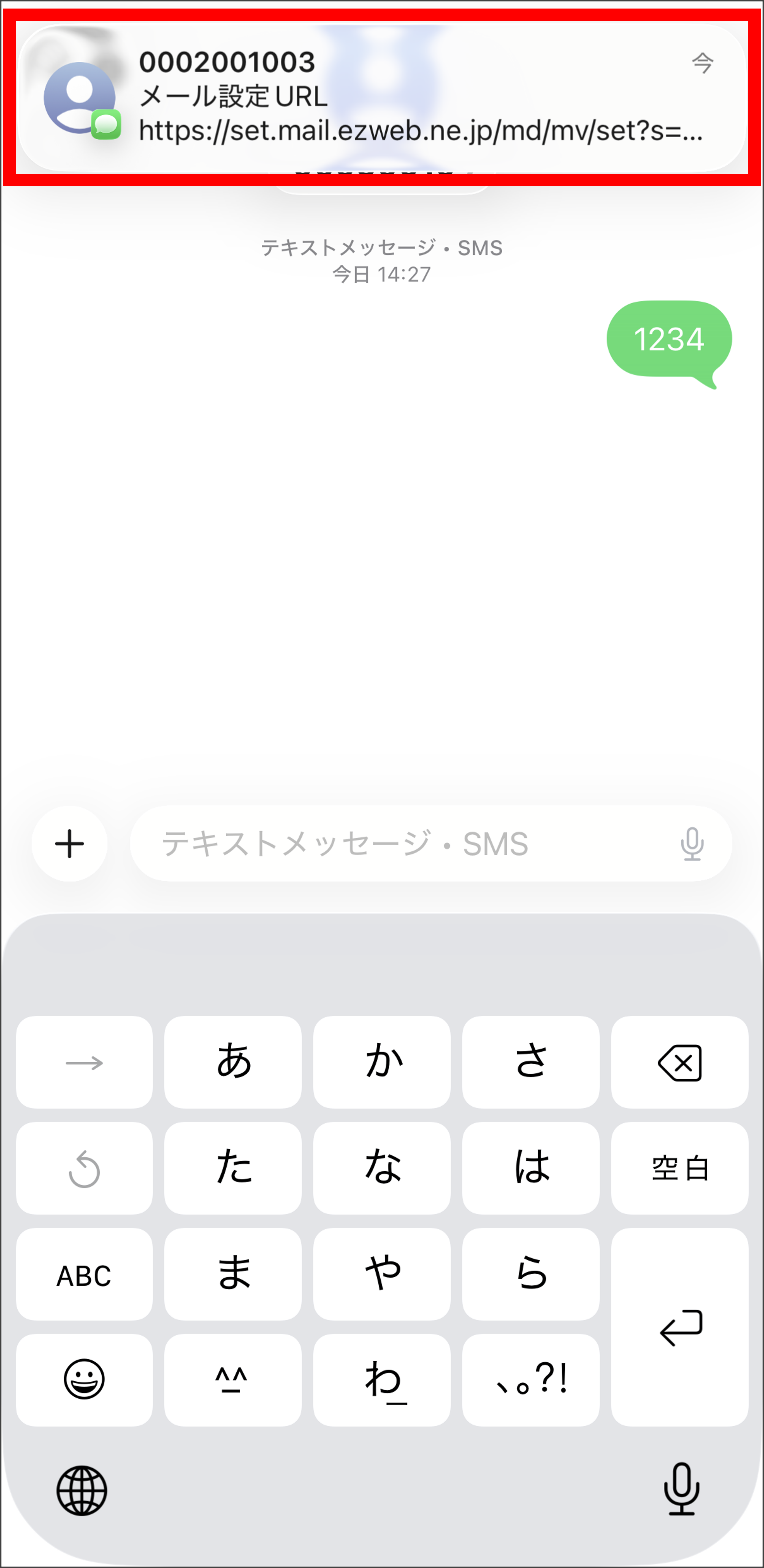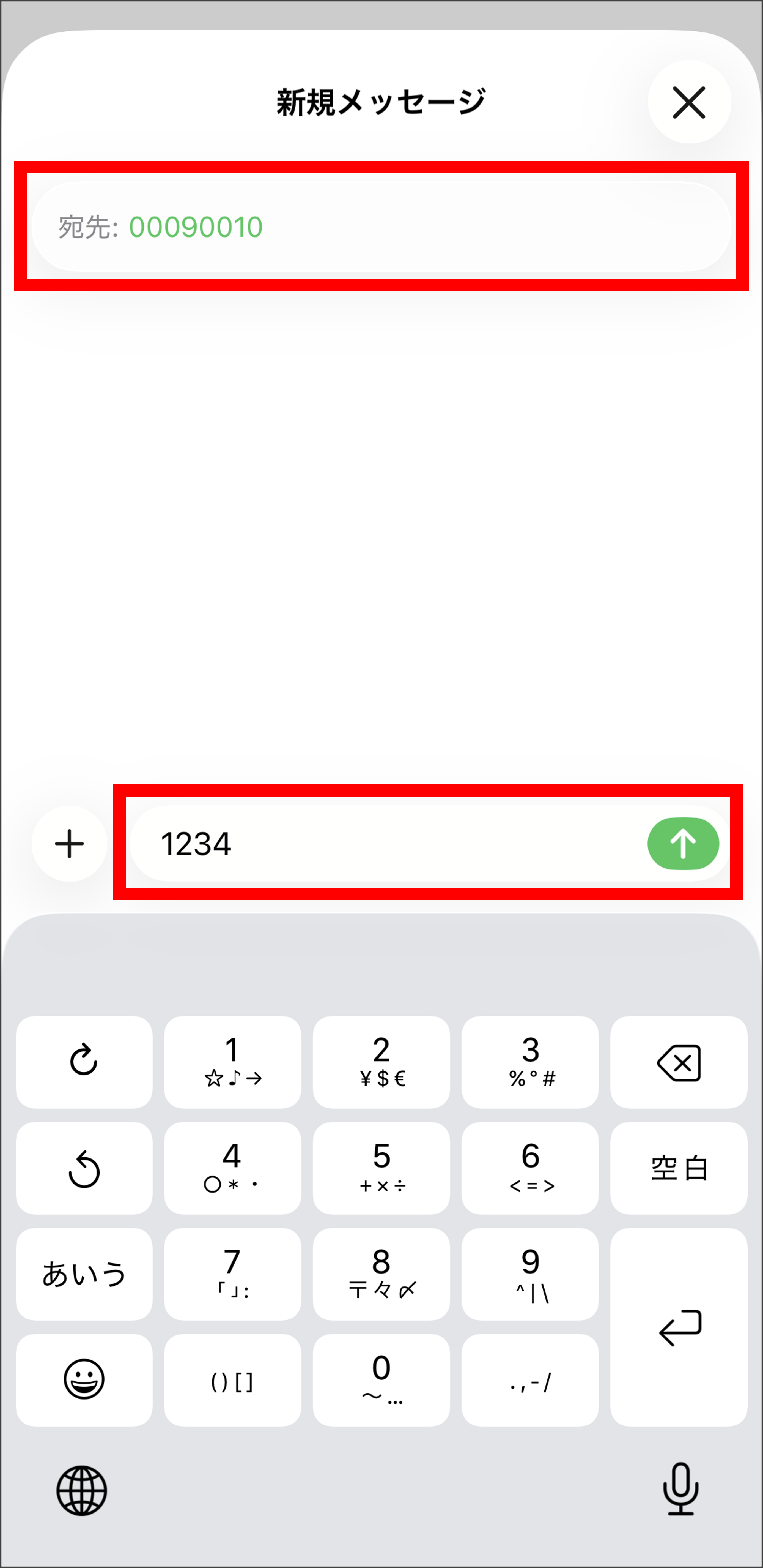 新規メッセージ作成の画面が表示されます。宛先に「00090010」、本文に「1234」と入力して、[↑]をタップして送信します。