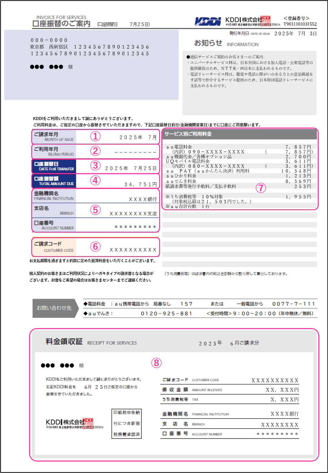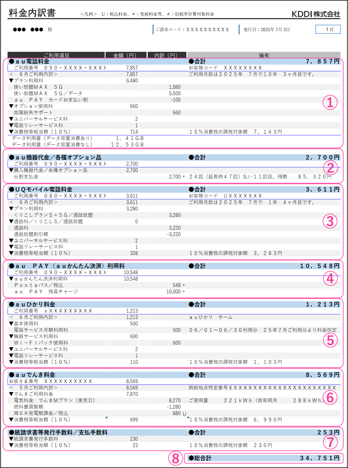 ご契約番号ごとの利用額、割引額などの内訳が確認できます。 ここでは請求書サンプルで各サービスの記載をご説明しています。