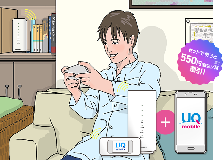 ※1.[対象]UQ mobile回線と同一名義のWiMAX 2+回線でギガMAX月割をお申し込みいただくと、UQ mobileの月額基本使用料から所定の料金を割り引きます。