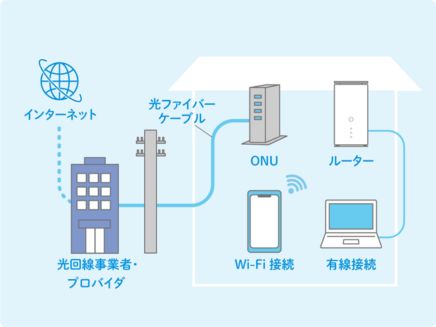 特にプロバイダから各家庭まで光ファイバーがつながっている配線方式を、FTTH(Fiber To The Home:ファイバー トゥ ザ ホーム)といいます。