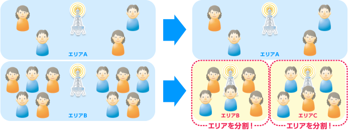 繁華街などの、特に人が多く集まる場所に、小型基地局を設置することでつながりやすさの維持・向上に努めております。すでに、新宿、渋谷、池袋では対策を実施しており、今後も拡充を進めてまいります。