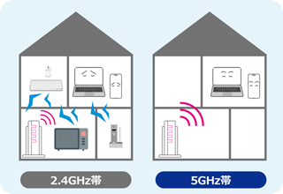 | 5GHz帯 | 家電やBluetoothなどとの電波干渉がほとんどない |