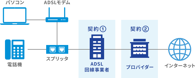 ADSLとは、「Asymmetric Digital Subscriber Line(非対称デジタル加入者線)」※1の略で、敷設された電話回線を流用して通信ができるインターネット回線です。