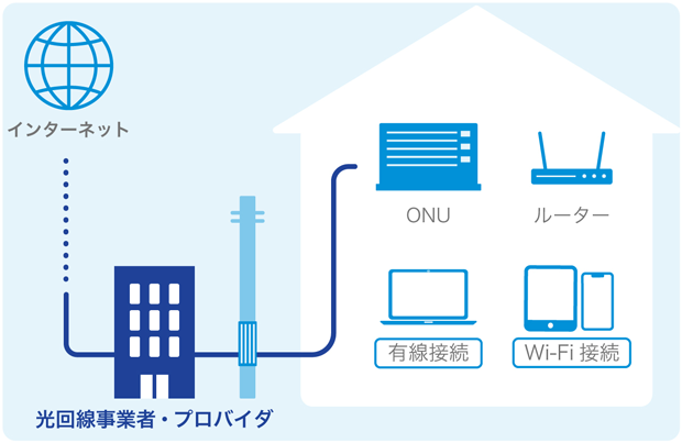 光信号をデジタル信号に変換する必要があるため、ONU(光回線終端装置)や、HGW(ホームゲートウェイ)といった通信機器を使用します。