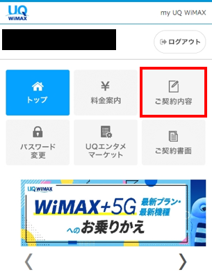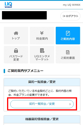 my UQ WiMAXにログイン後、「ご契約内容」をタップします。