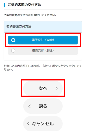 「契約書面交付方法」で「電子交付」か「書面交付」のどちらかを選択します。「次へ」をタップします。