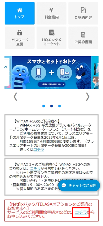 トップ画面を下にスクロールし「Netflixパック/TELASAオプションをご契約のお客さまへ」内の「コチラ」をタップします。