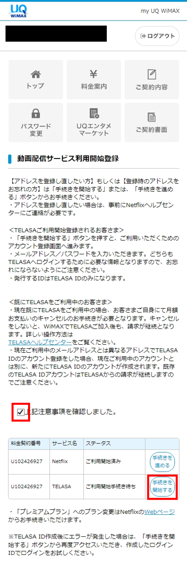 「動画配信サービス利用開始登録」に記載の内容をご確認の上、チェックボックスにチェックします。その後、「手続きを開始する」ボタンをタップします。