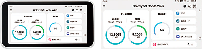 大画面に期間内のデータ使用量や設置場所の電波強度がわかりやすいメーター形式で表示され、設置のベストポジションを簡単に探せます。