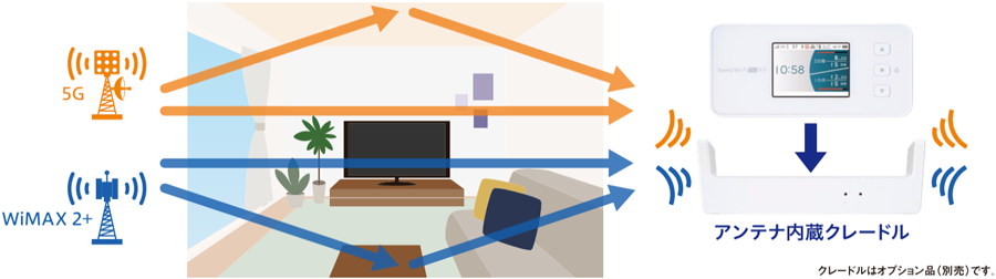 クレードル(別売)の両サイドには、5G*9とWiMAX2+対応のアンテナを内蔵。