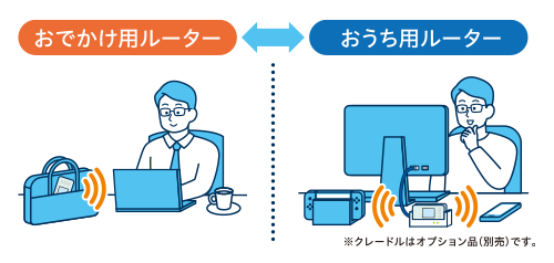 おうちではクレードルに挿して充電しながら無線/有線LANを利用できます。